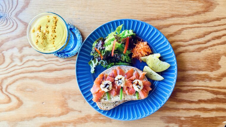 「パッと見て、誰もが『ひまわりだ!』とわかるようにしたかったんです」と語る西牧さん。ベースにたっぷり塗られているのは、オーストラリアのカフェでも定番の「フムス(ひよこ豆のペースト)」です。ひまわりの花びらにはスモークサーモンと卵サラダ。見ているだけで、なんだかこちらまで元気をもらえるような一皿です。