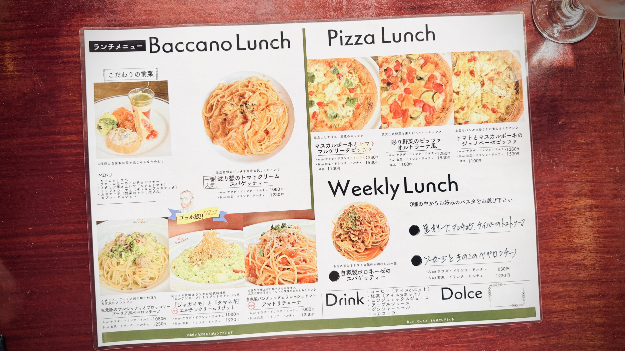 ランチタイムには、サラダが付く「Aセット」と前菜が付く「Bセット」があるのですが、どちらもドリンク、ドルチェ付き!
