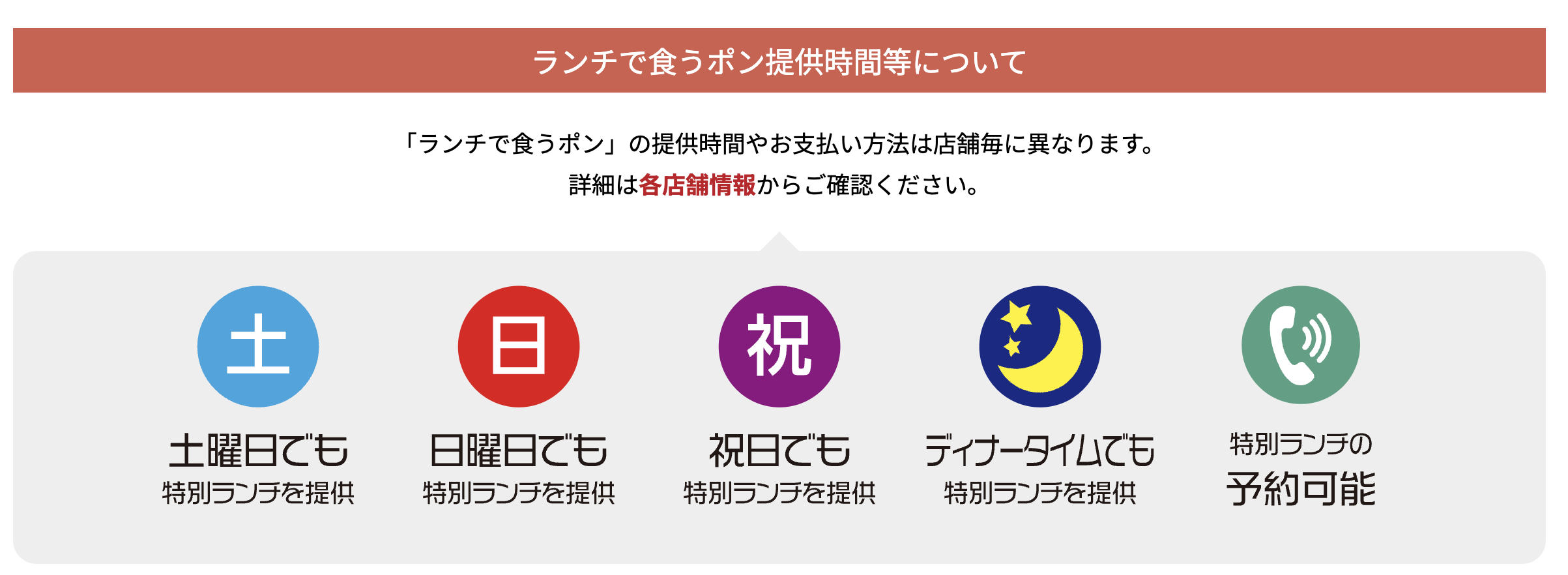 特設サイトでは、各店舗のページにアイコンがついていて「土日祝も提供あり」「ディナータイムも利用可能」「予約可能」といった情報が一目でわかるようになっています。