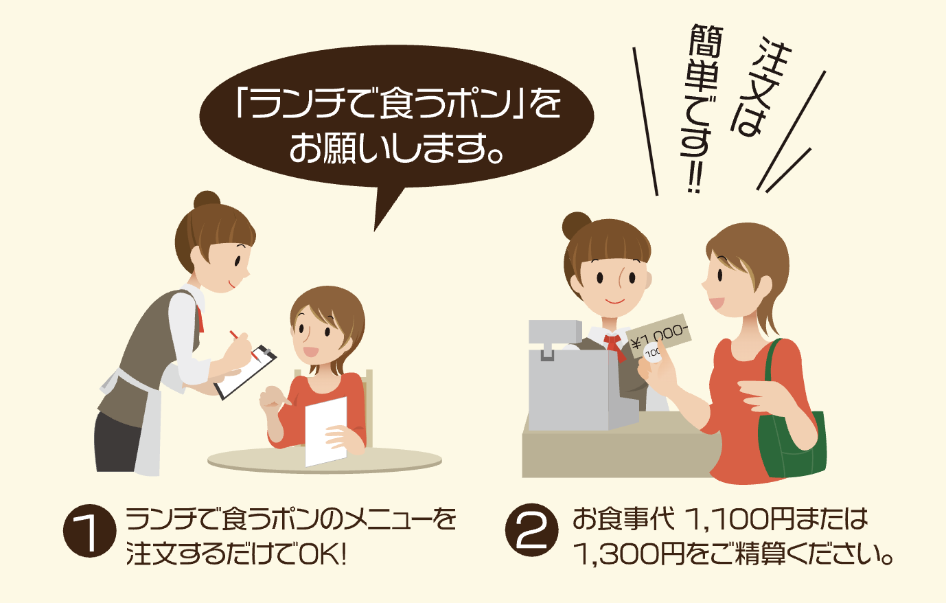 お得に精算:食事後、食事代(1,100円または1,300円)を会計します。