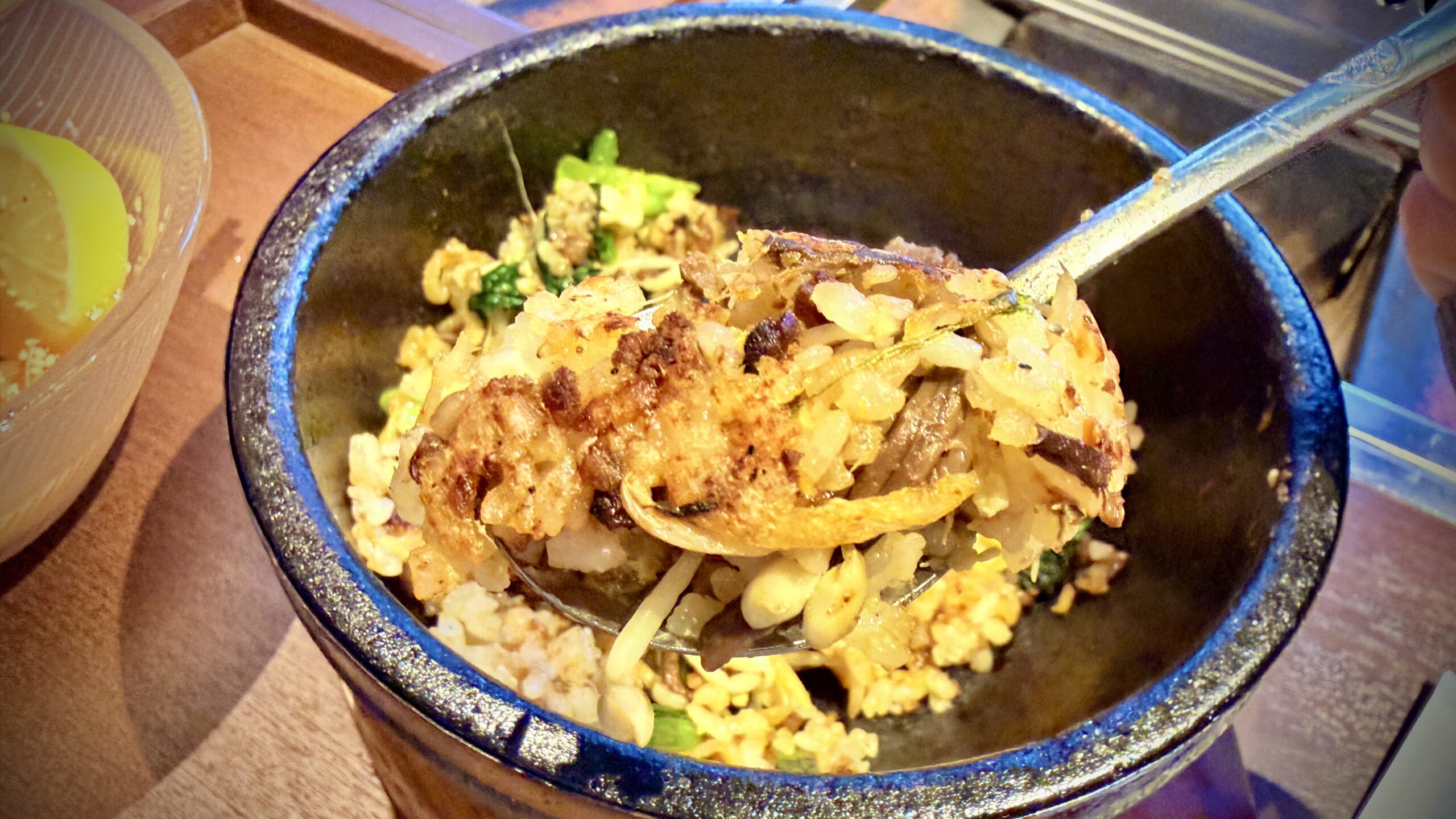 熱々の石肌に押し付けて作ったカリカリのお焦げに、シャキシャキの自家製ナムル。そして、上杉ならではの牛たんそぼろ! 噛み締めるほどにお肉の旨味が口いっぱいに広がり、スプーンが止まりません。