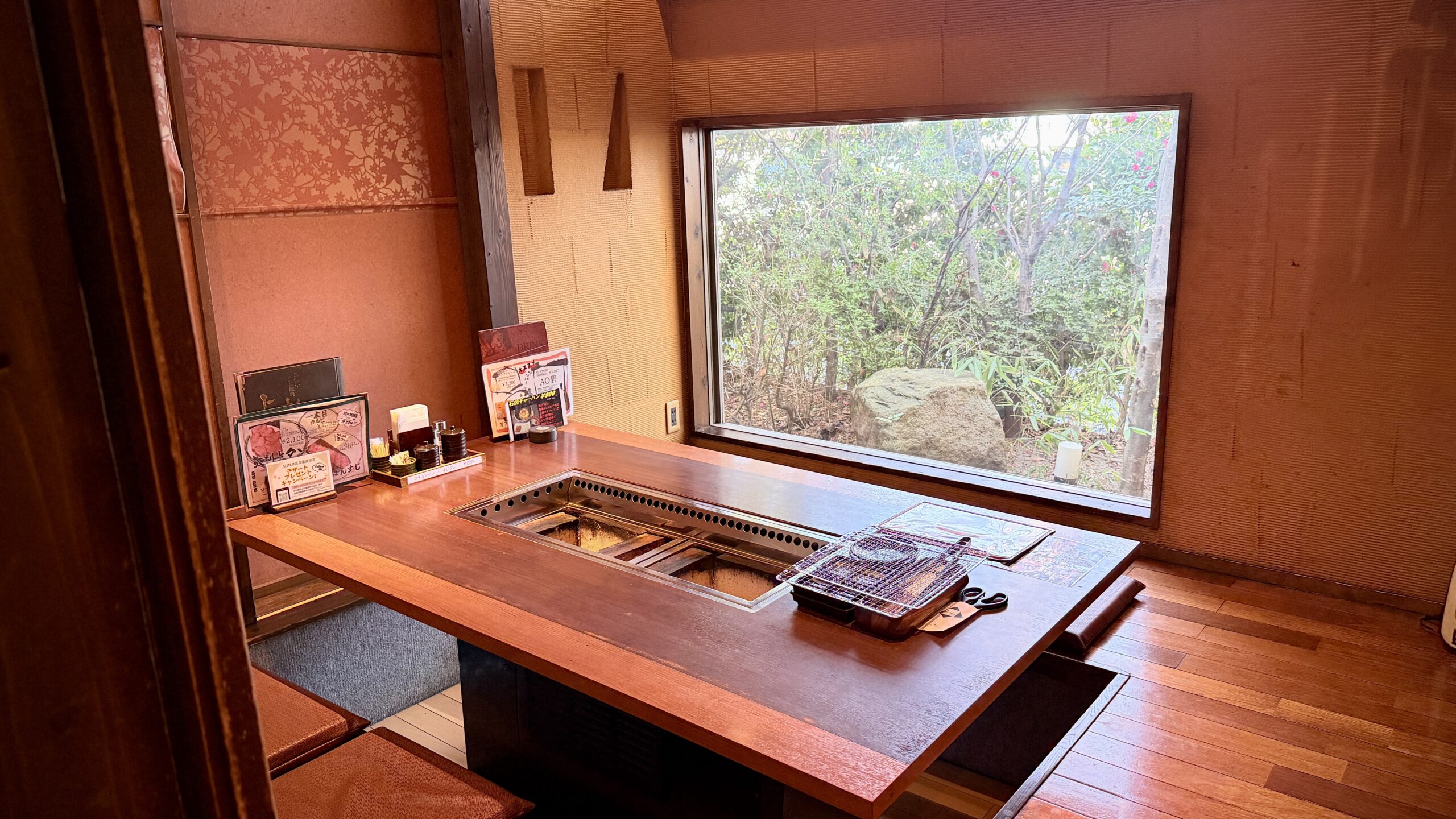 窓から緑を望む、ゆったりとした掘りごたつ式の個室