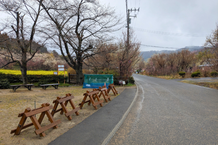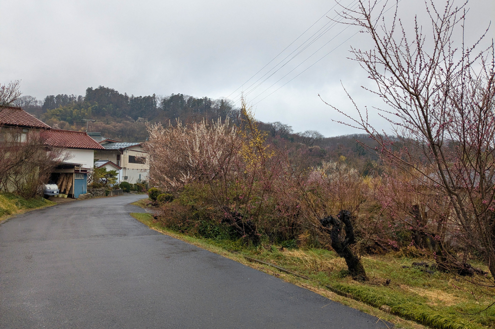 東町集会場から伸びる小道を3〜5分ほど歩けば、もう花見山のふもとです。一般道を歩くルートなので、近隣住民の方の車両通行には充分にお気をつけください。