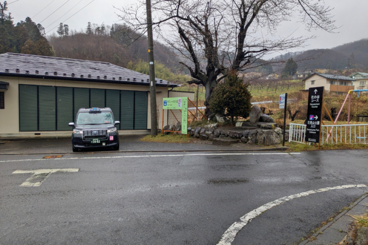 「物産ひろば」の裏手には「花見山本部」や「タクシー専用乗降所」があります。東町集会所に戻らずとも、ここから定額タクシーが利用できるので、電話や配車アプリでタクシーを手配するのがオススメです。