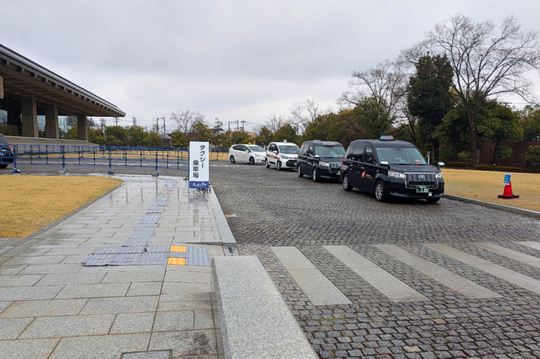 美術館からタクシーに乗車する場合は、美術館を出て左手、図書館前のエリアが臨時のタクシー乗り場になっています。開けた作りで立て看板もあるので、迷わず利用できるでしょう。