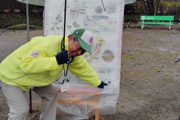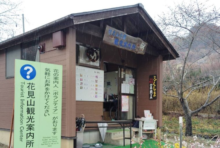 ふもとエリアをそのまま真っ直ぐ進むと、花の案内人(ボランティアガイド)の拠点「花見山観光案内所」があります。黄色いジャンパーが目印の「ふくしま花案内人」たちがあたたかく迎えてくれました。