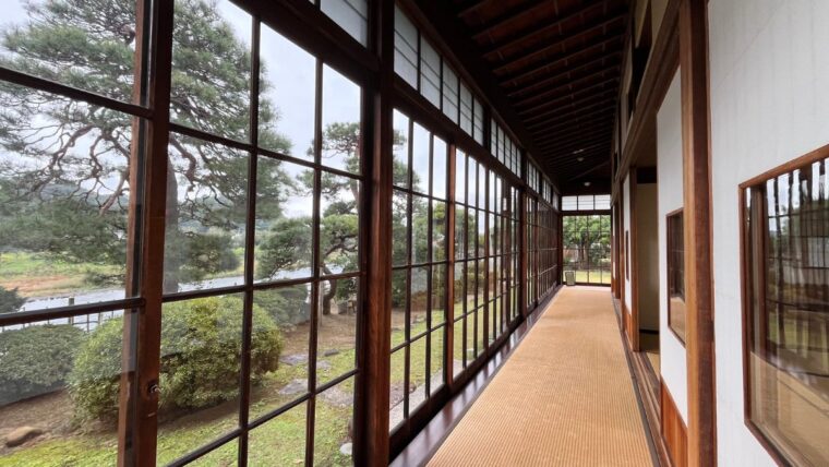 縁側に使われている窓ガラスは、ドイツ製の手作り板ガラスです。手作りならではの微妙なゆがみが景色に味わいを与え、どこか懐かしい雰囲気をつくり出しています。このガラスは東日本大震災でも割れなかった「奇跡のガラス」として知られています。